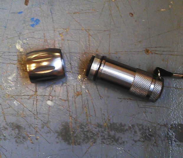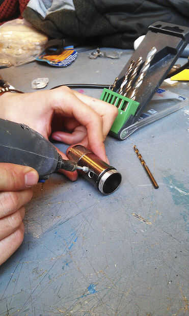 Necesitamos hacer 2 pequeños agujeros en el tubo para la posición de los 2 interruptores. Intente perforar con un taladro fijo, esto hace que el orificio derecho y en la posición correcta. Afther perforación, usar una dremel para trabajar los bordes.