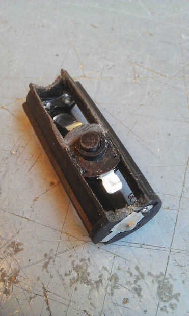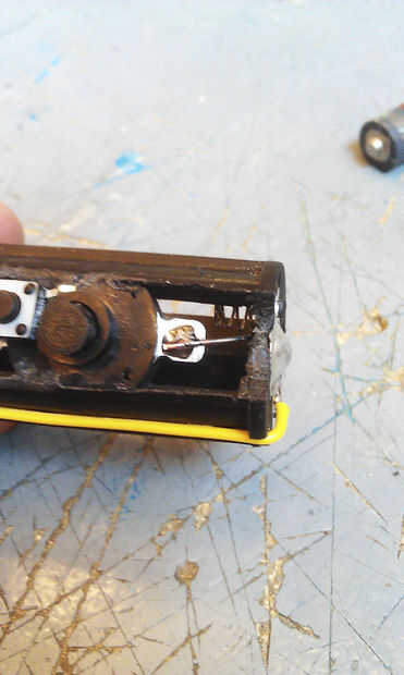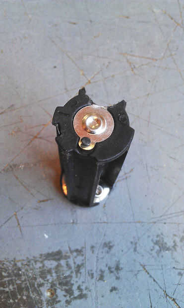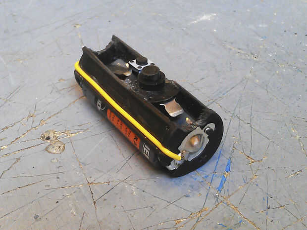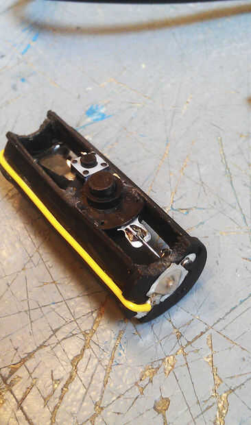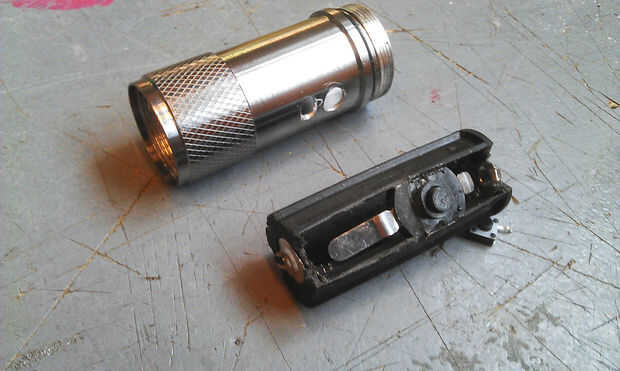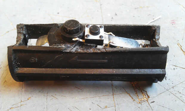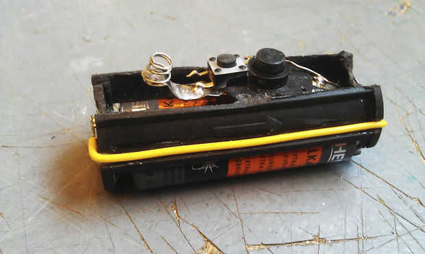 Cuando su equipo electrónico, sólo necesita volver a poner la batteryholder entera en el tubo. Ahora hay un problema: los interruptores están en la manera de deslizar correctamente en el tubo. Esto puede funcionar perfectamente si se empuje hacia abajo el interruptor grande y luego deslícela en el tubo. Asegúrese de que usted primero deslícela en el tubo junto a los orificios de los interruptores. Cuando es lo suficientemente profundo, simplemente gire la cosa y el interruptor hará clic por fuera del agujero.