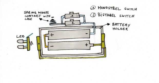 Después de colocar los interruptores, es básicamente justo tras el diagrama de cableado del cuadro. Tenemos que hacer contacto entre positivo y negativo del soporte de la batería (cable amarillo). También en contacto con los interruptores en el lado negativo de la batteryholder.