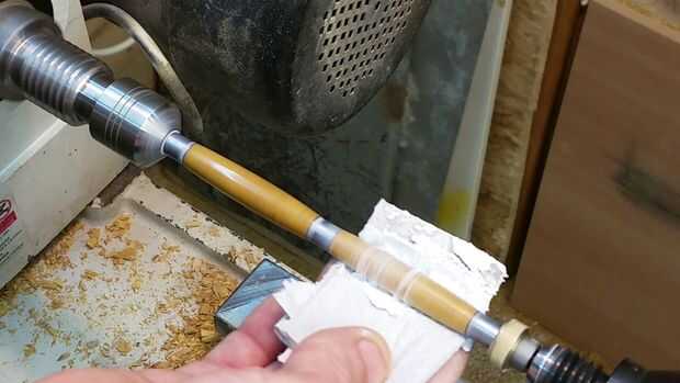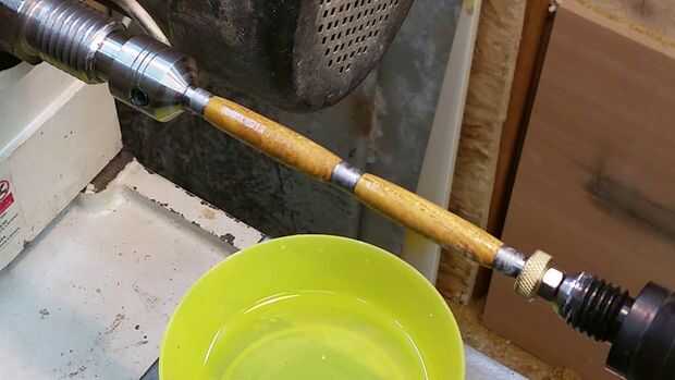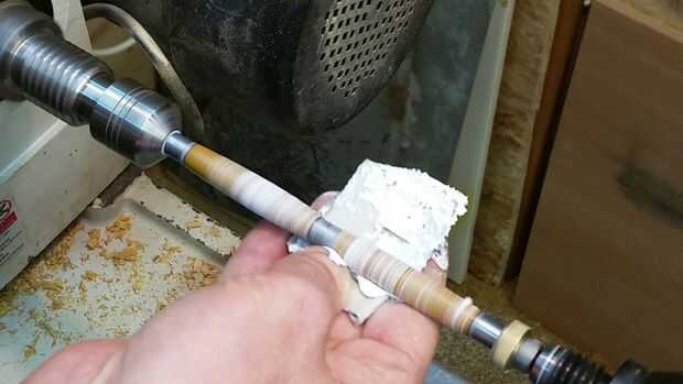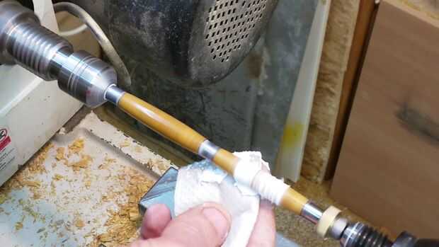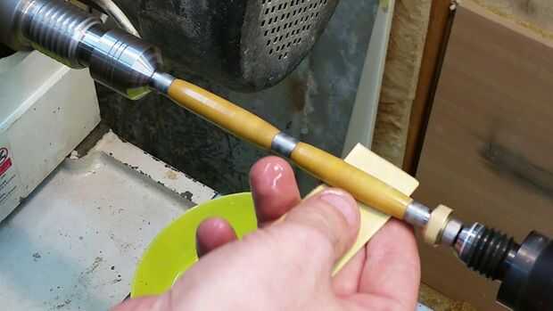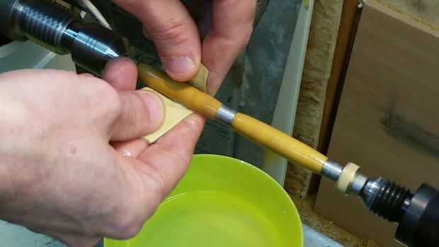 El primer paso es lijar la CA abajo liso, y hacerlo con una lija de grano alta (yo usé 1200 y 1500) y agua. Agua pura. En este punto, la madera, aunque no se ve como él, está cubierta de plástico, y el agua no molestarlo. Sólo rememeber para limpiar la cama mandril y torno cuando termine o de lo contrario se oxidará.