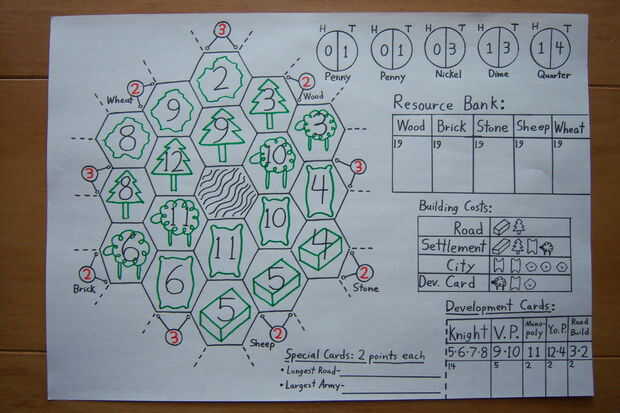 Pocos de nosotros llevan un tablero de hex, trozos de carretera, dados, tarjetas de recursos y toda la parafernalia un buen juego de Catan con nosotros diariamente. (Si lo haces, entonces mi sombrero está apagado para usted buen sir/señora.) Por qué pasé algún tiempo encontrar la manera de hacer un facsímil razonable con solo cosas que casi siempre tenga a mano: lápices, papel y cambio de bolsillo. Esto es para todos los tiempos estaban acampando y se olvidó de traer la Junta o fueron atrapados en el aeropuerto por una demora inesperada 4 horas.