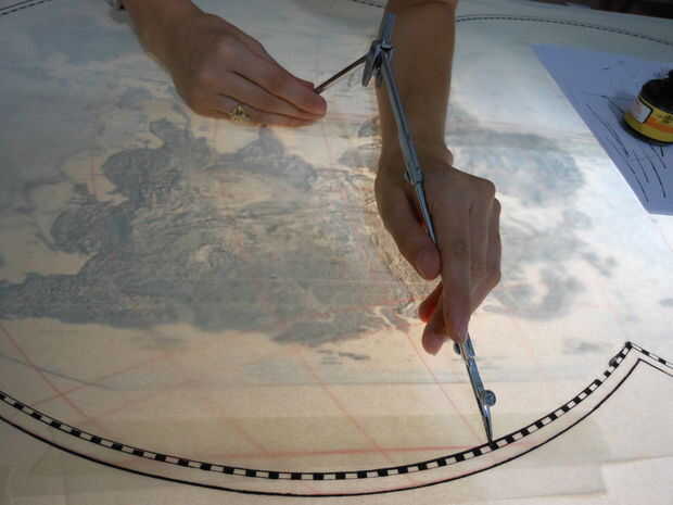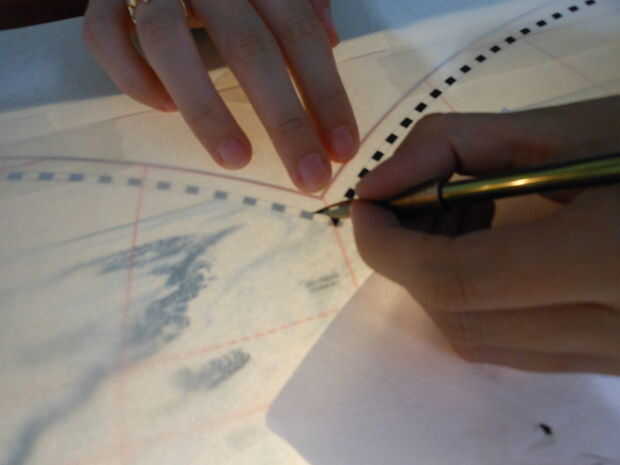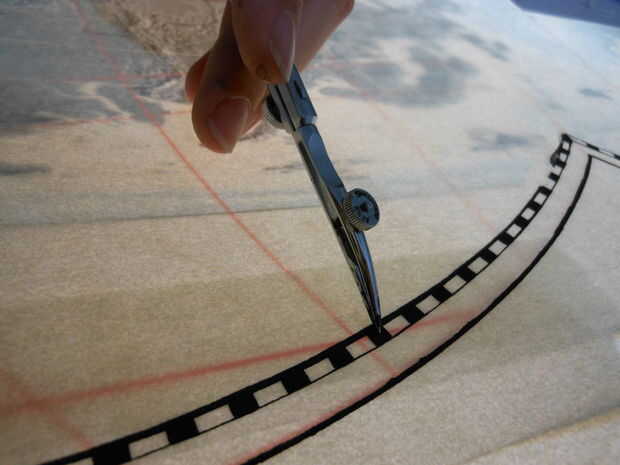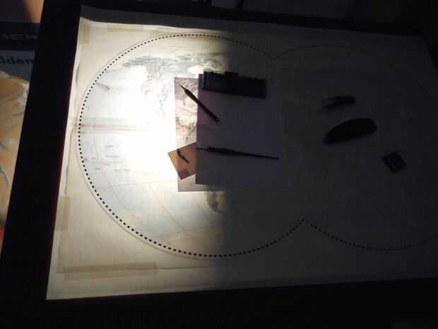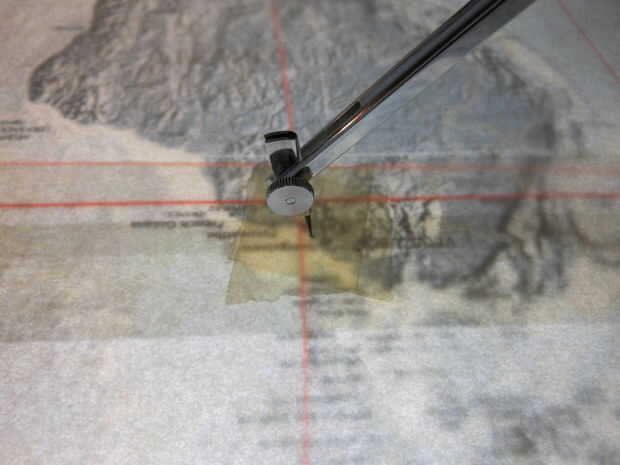 Grabó el mapa impreso en la parte posterior de nuestro pergamino, cuidadosamente como si nuestra vida dependiera de la alineación. Lo último que necesita es una línea de guía de moverse después de empezar a remontar.
