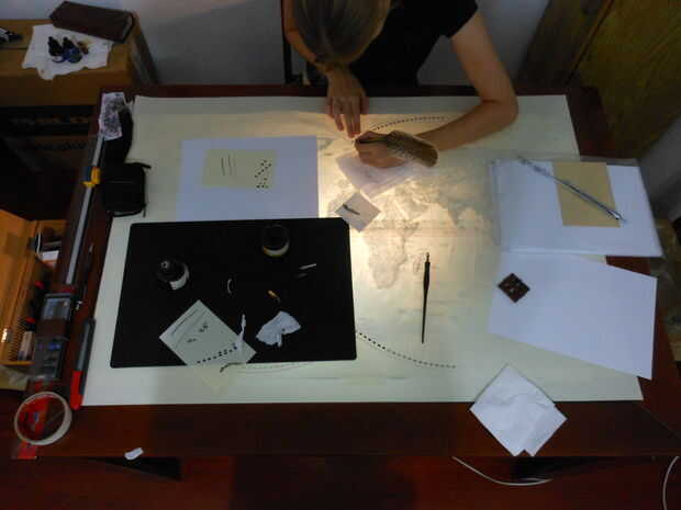 ¿Ver el papel de desecho ahí? Se usa. Siempre. Cada vez pienso tocar el pergamino con su pluma, hacer un pequeño rastro en otros lugares para asegurarse de que no gotee. Como teníamos la última hoja de este papel en la ciudad, no tomamos la oportunidad.