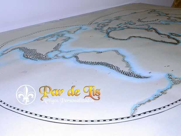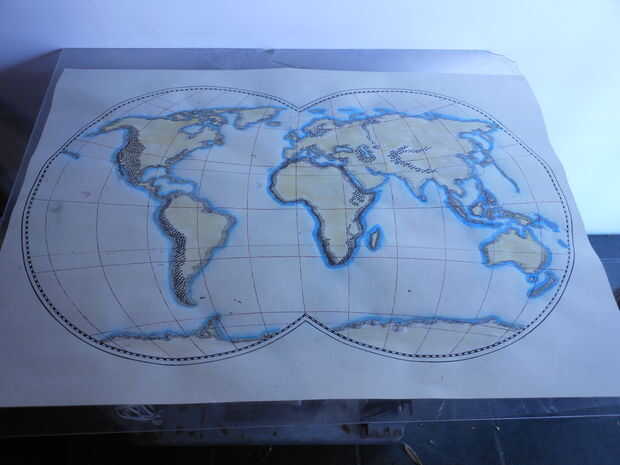 El lado exterior de las líneas de tierra primero fue pintado con una tinta de color óxido diluido, pero sentimos que no era tan buen aspecto y lo cubrió con un montón de acuarela azul. La tierra también fue pintada con acuarela. Irónicamente, la única parte del mapa que mojar no era el océano. Toda esta agua causó el papel pasar de plana a ondulada, que no era nuestra intención pero poco lo hace interesante (aunque realmente no recomendamos que acuarela).