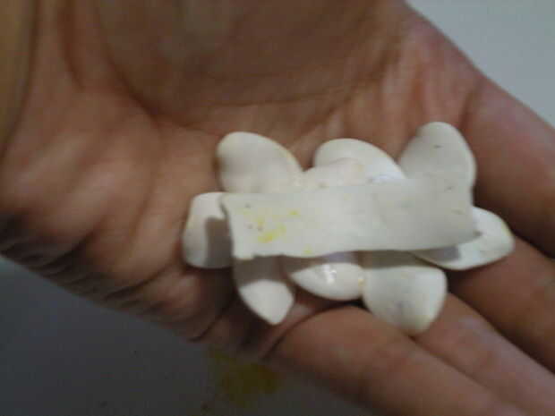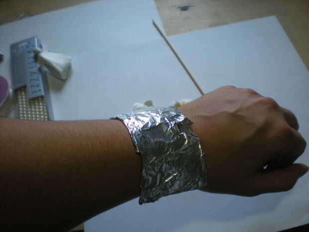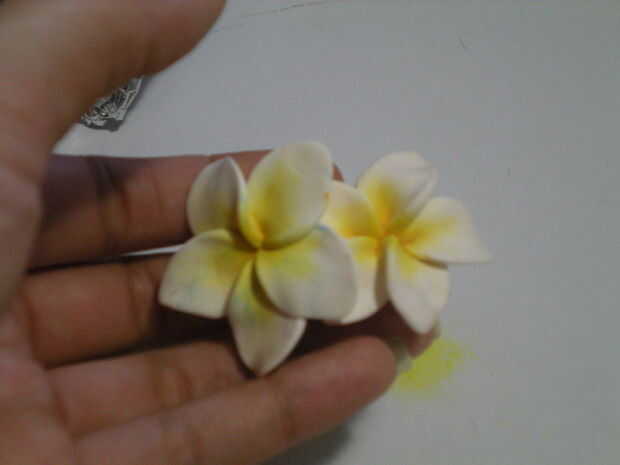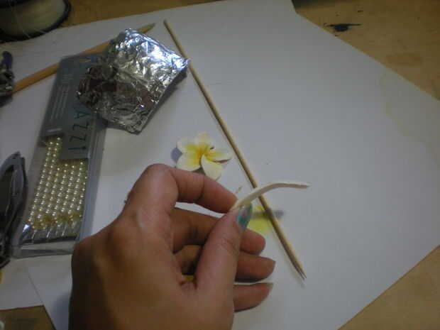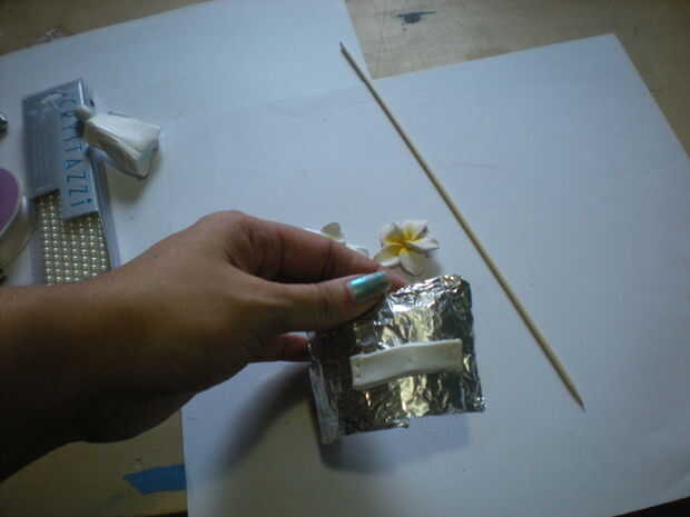 Antes de cocer al horno las piezas, usted necesitará hacer pequeña armadura para la base crear una superficie curva, lo hice haciendo un brazalete de papel y suavemente había formado la arcilla sobre la muñeca y coloque sobre la bandeja. Yo al horno la arcilla en el la armadura de papel de aluminio. A continuación las direcciones para la cocción de la arcilla. Las piezas de una vez horneado y enfriado apliqué E600 y pegado mis flores de plumeria a mi fundación. y ponga a un lado para dejar secar.