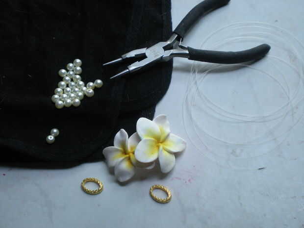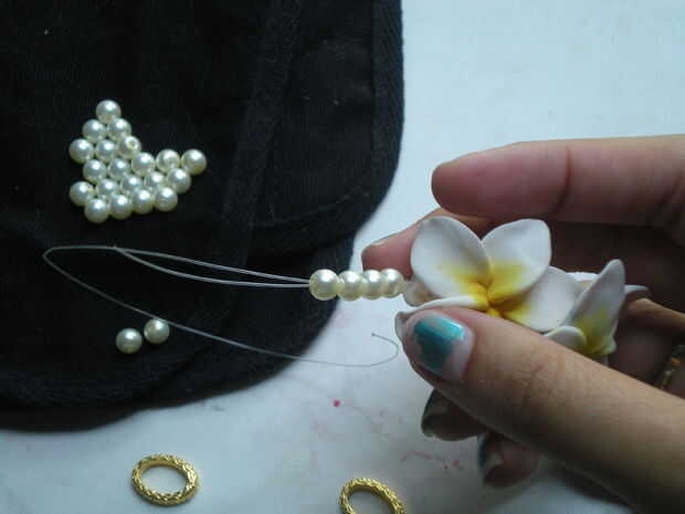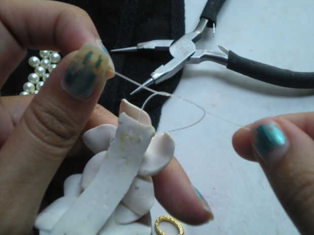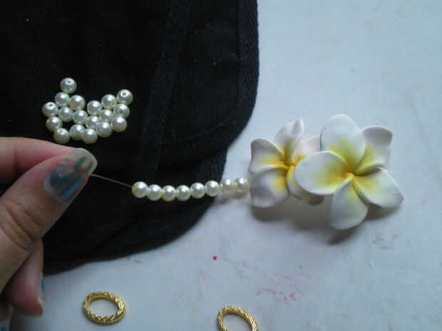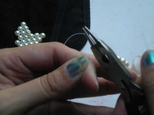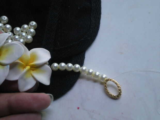 Bien su tiempo para empezar a poner las piezas juntas. El primer agujero con monofilamento del hilo de rosca y doble lo nudo deslice en 8 granos y atar al anillo del salto. Ocultar los extremos de la cadena de roscar del intothe espalda granos y recorte el exceso. Repita este paso para los orificios restantes, cada lado debe tener dos hilos de perlas Unidas a un anillo del salto...