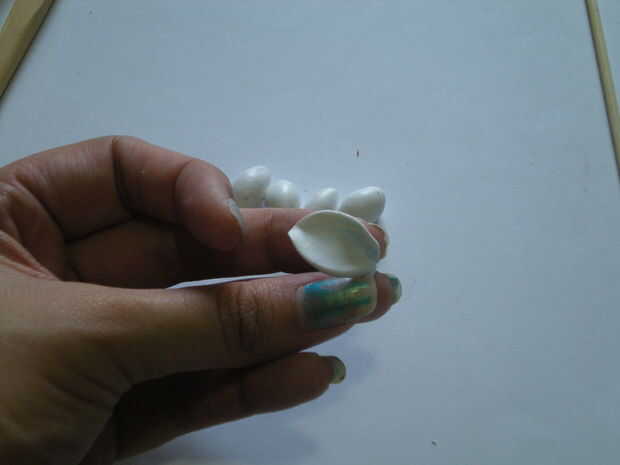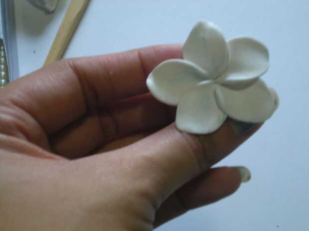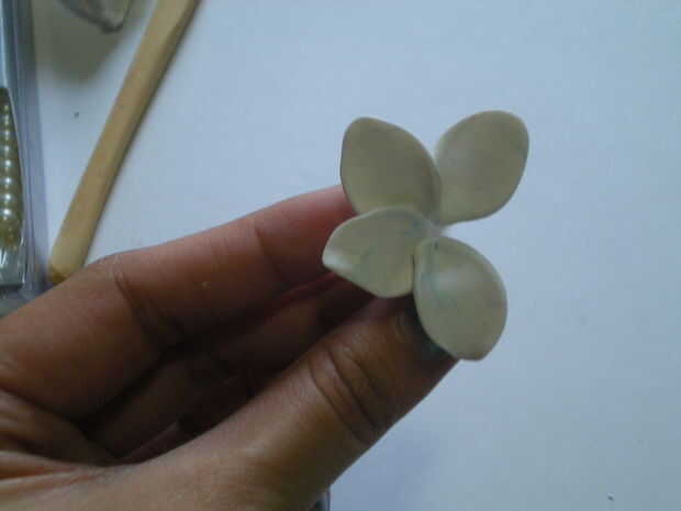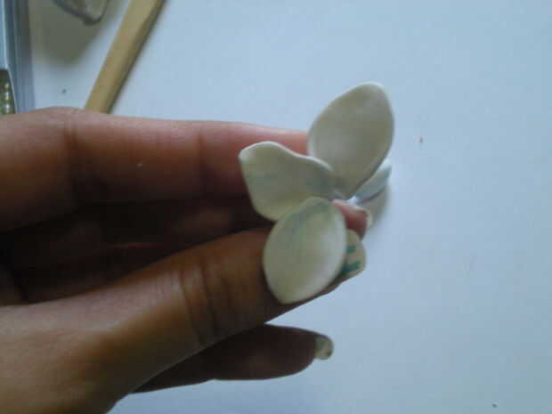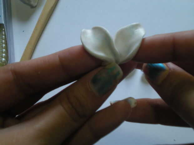 Acabado su pétalo doblando ligeramente en la parte superior. Ahora que te has hecho un pétalo situado a un lado con cuidado y hacer la siguiente, cuando se les une cuidadosamente superponiendo cada pétalo como vas. He tomado una foto para cada pétalo se agrega, cuando agregar el último pétalo suavemente gire la arcilla sobrante por debajo de ella para bloquear los pétalos juntos.