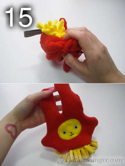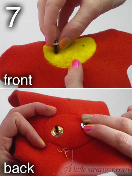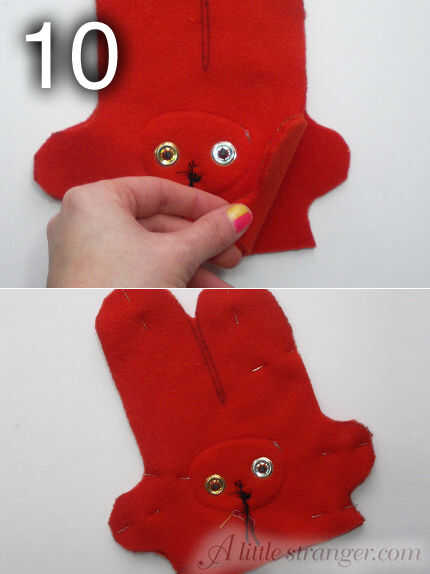 8) con puntada de hilo bordado negro en la nariz y la boca, empezar por hacer una 'v' de la nariz, luego hacer una puntada vertical hacia abajo desde el punto de la v. Por último coser una forma de 'w' por la boca.