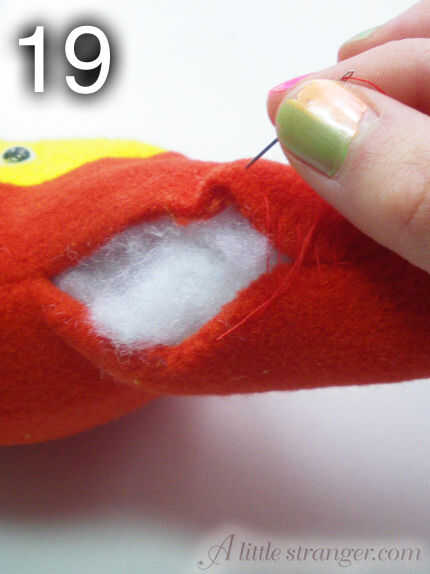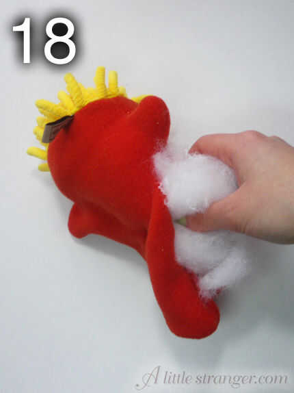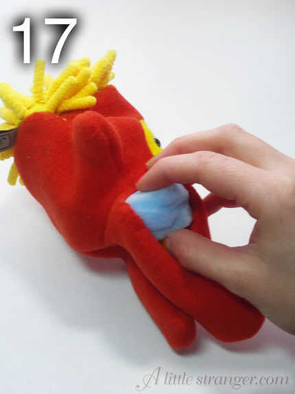 18) obtener relleno! Empuje el relleno en una pequeña cantidad en un momento, a partir de los brazos. Asegúrese de empujarlo firmemente alrededor del cuerpo por lo que la espuma insertar Mostrar dosent. Para terminar, rellena las orejas.