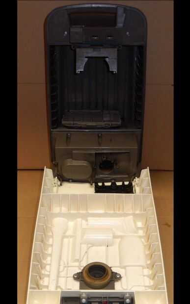Quitar las partes superior y posterior del cuerpo de la aspiradora que conectan el cuerpo con la manguera. Luego calentar un agarre de cuchillo de Stanley su respiración y cortar el tubo de plástico que fue la celebración de ambas partes.