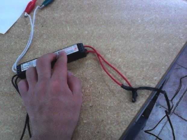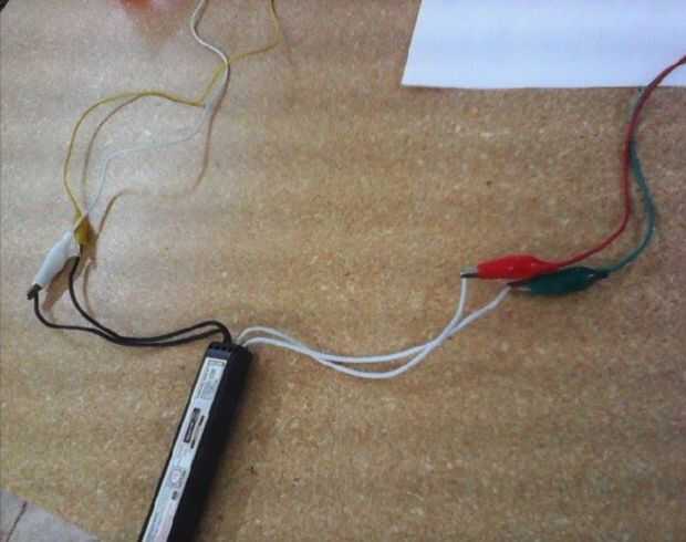 Coloca un cable caiman-caiman una cada cable blanco del balasto y un cable caimán-caimán una cada cable negro. Observa la imagen para guiarte.