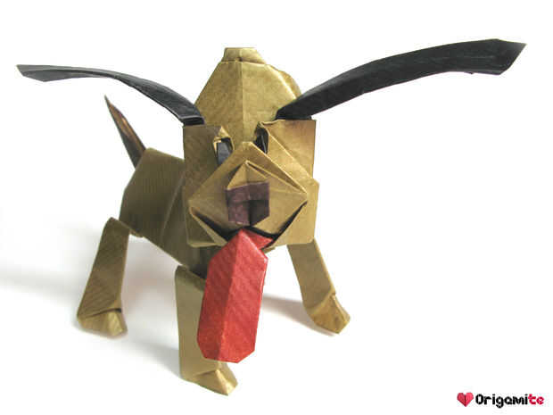 este perro de origami es mi propio diseño. Irónicamente esto comienza con la base de pescado. Si eres nuevo en origami, este es un buen modelo para usted porque es bastante fácil. Se mejora grandemente por colorante en él. Las orejas y la nariz puede