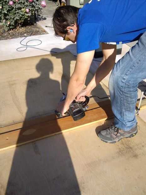 Hice el primer corte con mi sierra circular. Usted puede hacer todos los cortes de esta manera si no tienes una mesa de la sierra. Mantenga la madera contrachapada utilizando repuesto 2 x 4 o algo similar. La regla que uso es uno que hice, pero se podría utilizar otro tablero. La Junta de la abrazadera y ejecutar la sierra circular contra la regla.