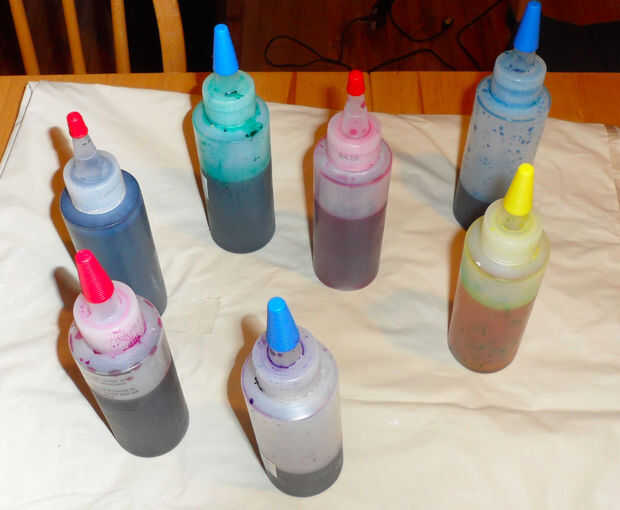 He comprado tinte suministros de Dharma Trading Co. y seguido las técnicas en su página web para mezclar tintes y morir. Mezclé 7 envases de 4 onzas del tinte, por lo que las chicas podían seleccionar sus colores favoritos. Fuera de esto, se utilizaron cerca de 12 1/2 onzas de tinta para 18 pañuelos.