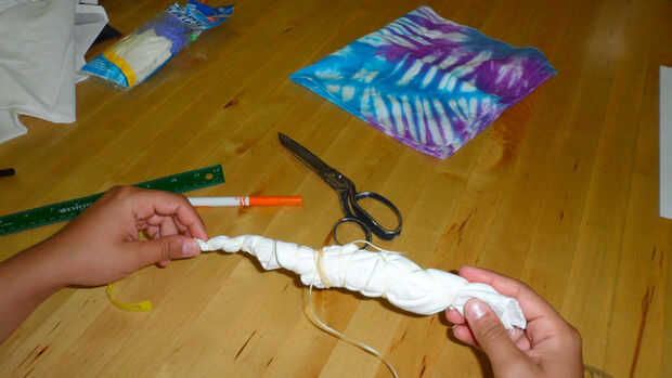Coloque una banda elástica a lo largo de la línea de pliegue. La línea marcada se elimina cuando empapado en ceniza de soda, por lo que la goma se delinean el estrellas del fondo.