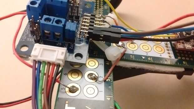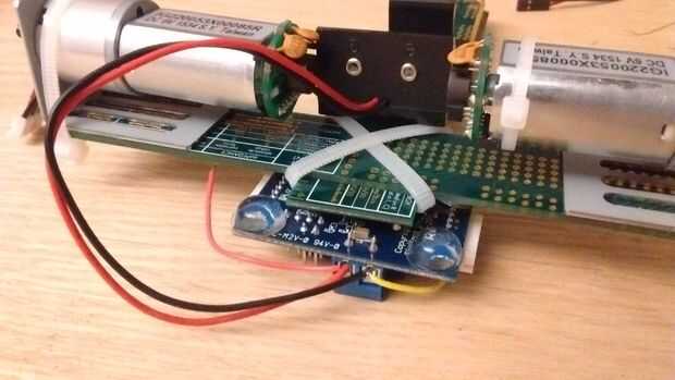 El chipKIT Cmod tiene un regulador de a bordo que puede recibir tensiones externas que van de 7V a 15V, por lo tanto conectando el positivo de la batería suministrar a una almohadilla de botón de centro en el eje trasero, luego a una almohadilla de botón de centro en el chasis y luego conectando el pin Vin (etiquetado como pin 1 en la pantalla de seda) en el Cmod al gran punto de contacto positivo , Soy capaz de proporcionar la fuente de alimentación positiva directamente a él. Para la conexión a tierra 0V decido conectar el terminal negativo de la batería hasta el punto de contacto de tierra en el conector ICSP (JP2, el pin 3) proporcionar el terreno común a la Cmod.