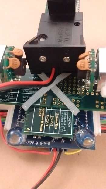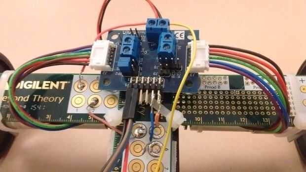 El PmodDHB1 es un módulo de puente H dual que decidí utilizar de modo que el pude controlar dos motores DC según sea necesario. Para montar el PmodDHB1 en el eje trasero, todo me encontré con que tenía que hacer era tomar dos juegos de cables procedentes de los motores de DC y adjuntar a las respectivas tomas de Pmod; Esto proporcionó la suficiente tensión para fijar la Pmod sin necesidad de lazos zip o soldadura.
