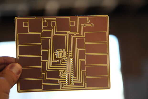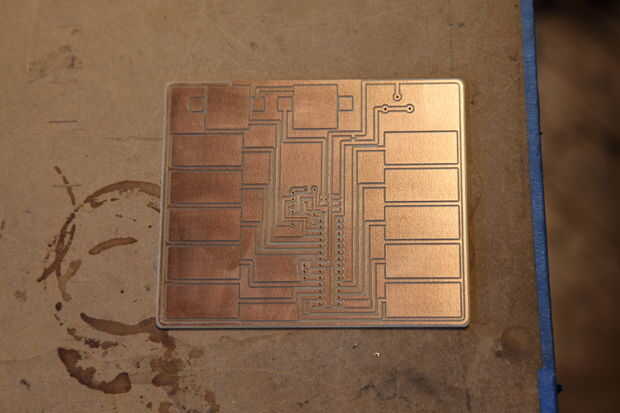 Este sintetizador es muy impresionante ya que no requiere ningún botón! Algunas personas realmente inteligentes en las Interwebs escribieron el código que nos permite utilizar un Arduino a sentido cuando un dedo toca un cable conectado a uno de los pasadores. Normalmente tenemos cables y hacer algún tipo de puntos de contacto de las teclas, pero en su lugar podemos utilizar la Othermill para moler las teclas de derecha en una pieza de cobre de circuitos, que nosotros ya estamos utilizando el circuito! Super impresionante.