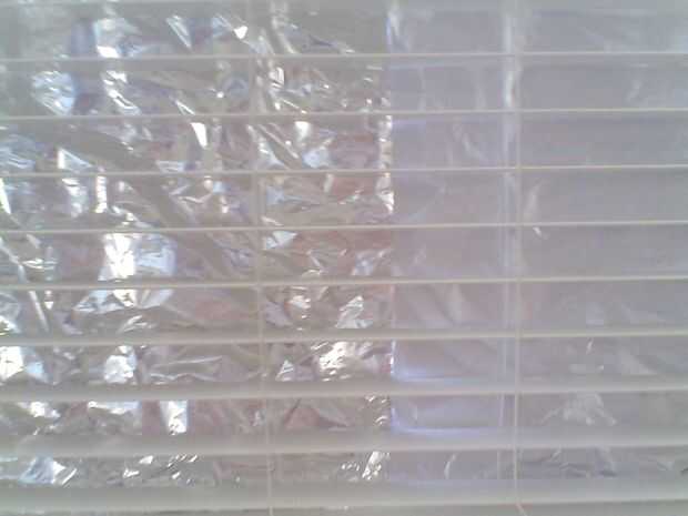 Cortar tiras de papel para cubrir la parte inferior de la mitad de la ventana. cinta de la hoja de la ventana. Hacerlo en sólo el lado superior únicamente y deje que el papel cuelgue. Asegúrese de que la parte Brillante quede hacia fuera para ayudar a reflejar el calor. Persianas de la ventana deben mantenerlo en su lugar. Usted quiere asegurarse de que usted puede todavía salir fácilmente en caso de emergencia.