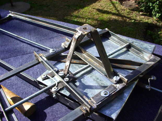 El apoyo es una pequeña torre de tres patas simple con orificios para los tornillos de un cuarto de pulgada para pasar, con tuerca y las arandelas.