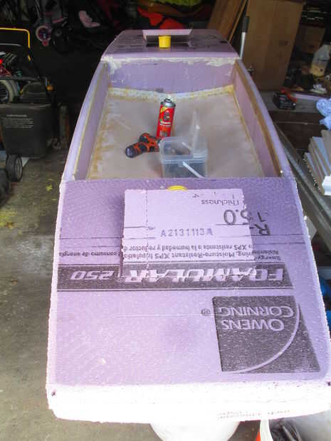 En lugar de madera contrachapada, construí el barco totalmente de 1" XPS (poliestireno expandido espuma insullation), en lugar de cinta de fibra de vidrio y epoxy Marina, solía cosas gran expansión espuma pegan todas las juntas e impermeable les. XPS es espuma de célula cerrada impermeable gran materia (GS) espuma de célula abierta, es chupar agua y no dejarla ir, también no puede hacer frente a UV.