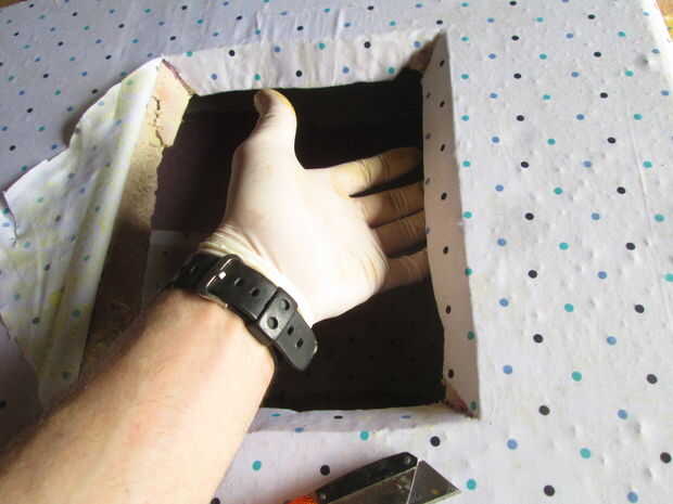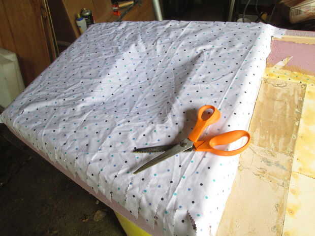 Primero rompí la piel suave de la espuma con un fondo de pantalla de herramienta de perforación, imagino que un rodillo de madera con un montón de clavos sobresale, que hace un gran trabajo de dar algún diente a la espuma. (y las manos si no tienes cuidado) A continuación, recubiertos de espuma perforada con TiteBond II (TB II) y luego alisó la sábana de algodón en el TBII. Una vez que la tela era pegada abajo, llenó el tejido exterior vaya pintura, entonces arriba lo cubierto con mi color favorito, amarillo.