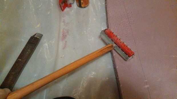 Me parece un pesado paso sobre cada sección de la espuma es fino, que puede hacer varias pasadas para incrementar las perforaciones si quieres. Los agujeros más que muestra, mejor. Estas perforaciones también dan la mejor indicación que usted tiene la cantidad perfecta de pegamento en la espuma.