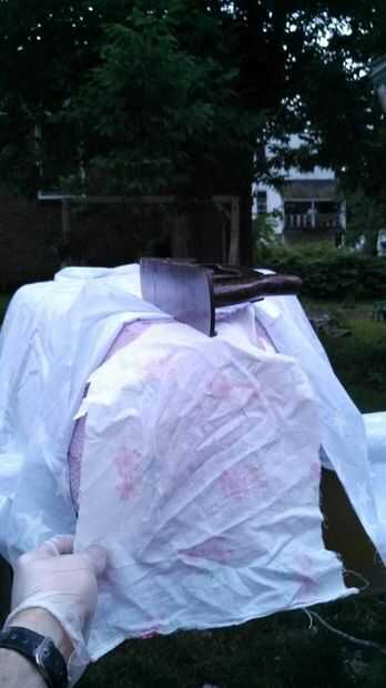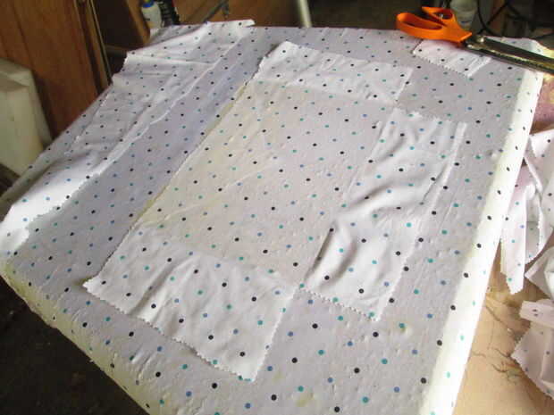 Corte a la tela antes de que el pegamento está en y de curado es crítico! Prefiero trabajar en secciones, virar la tela a la espuma con pasadores o brochetas, cortar a 6 pulgadas se superponen en cada lado, luego marcar los bordes y cortan outs con un lápiz suave para ayudar a alinearlas cuando es curado el pegamento.