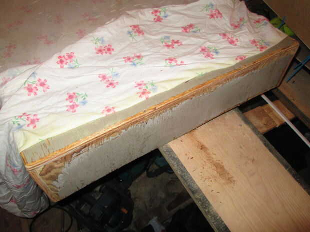 Empezar por trazar la tela para cubrir el objeto de madera. En este caso estoy demostrando en un campanario de iglesia. Tuve que fabricar nuevos paneles de madera contrachapada y también pegar algunos de los consejos de ajuste volver juntos como habían agrietado y derrumbado.