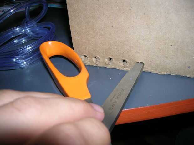 Esta fue la parte más larga para mí, yo estaba usando un par de tijeras para un taladro. Si puede, utilice un taladro con una broca de 1/4 pulgada. Esto hará que la tarea de poner los agujeros en el cartón