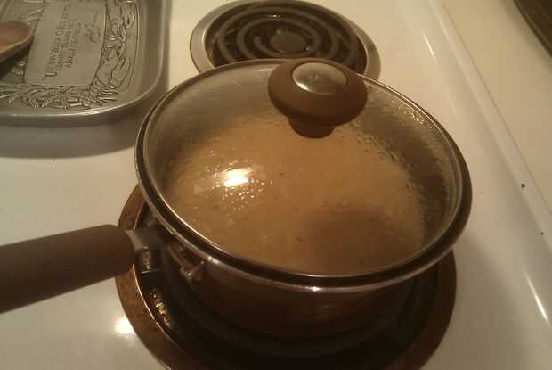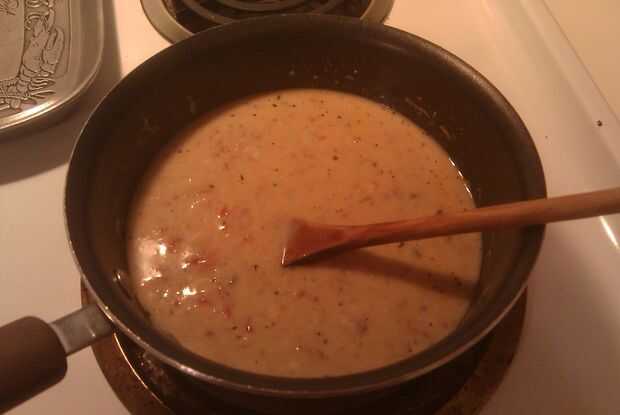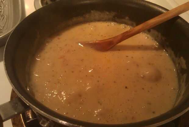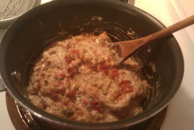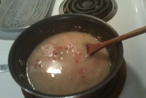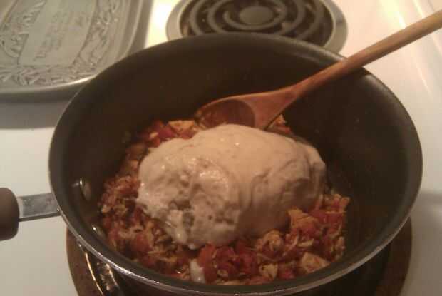 Después de cocidas por el pollo y tomates agregue la lata de sopa crema de hongos. También Mezcle 1 lata de agua. Sólo tiene que utilizar el poder de la sopa. Suba el fuego, para llevar la mezcla a ebullición. Asegúrese de revolver. Después de hervir por un par de minutos reducir el fuego para mantener caliente. Conseguir una cuchara completa y una vez que esté lo suficientemente frío como para sabor, le dan un sabor. Trate de no quemar la lengua. Agregue cualquier condimentos crees que necesita y revuélvalos en si es necesario.