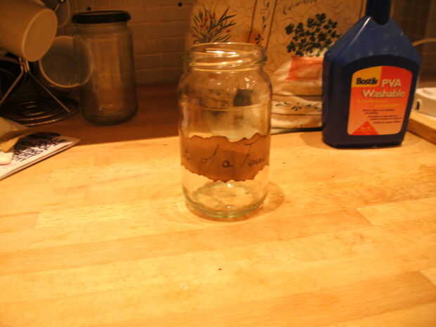 2. tomar un frasco y coloque la etiqueta en él. Sujeta la etiqueta en su lugar con una mano, otra mano para suavizar una capa delgada de pasta PVA de la etiqueta hasta que ocupa su lugar.