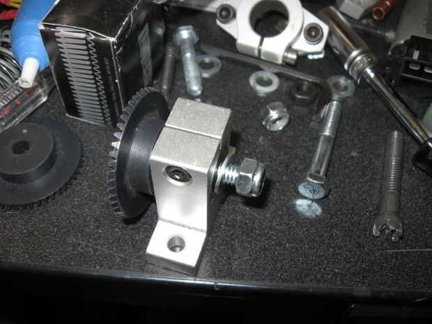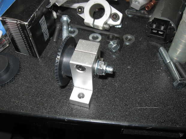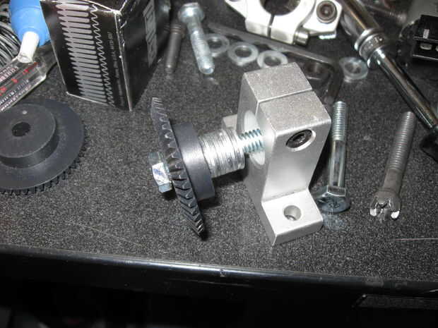 Coloque el perno de 2 pulgadas a través del engranaje con el bisel hacia él perno cabeza. Uso 9 espaciadores arandelas entonces ponen el perno a través del bloque de soporte y cojinete a continuación usan otro espaciador arandela y una tuerca de seguridad de nylon. Volver a apretar hasta que el mecanismo gira libremente, pero no ata. El engranaje no debe resbalar sobre el eje.