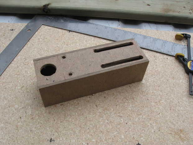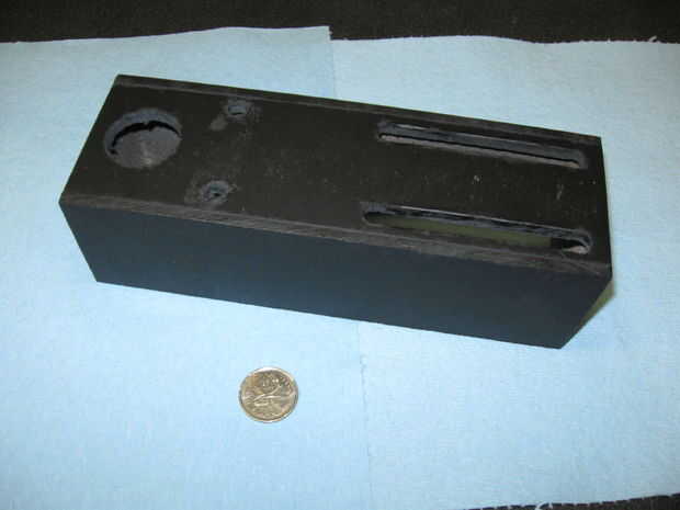 Perforar y cortar todos los agujeros luego construir la base con más piezas de madera prensada que se cortan a la medida. I 4 piezas de las mismas dimensiones y las secciones de corte uno de ellos de 2,5 pulgadas para uso como extremos. Montar la base luego el pegamento para unir. He utilizado pegamento pero pegamento de madera también funcionaría. Acabado de la base según sea necesario. He preparado y había pintado negro mate.