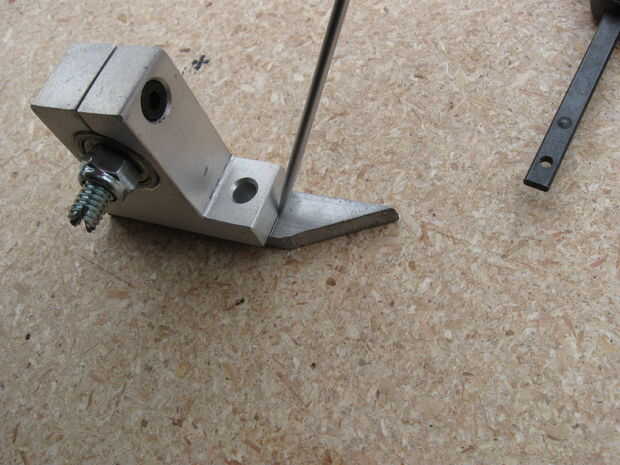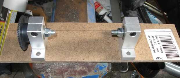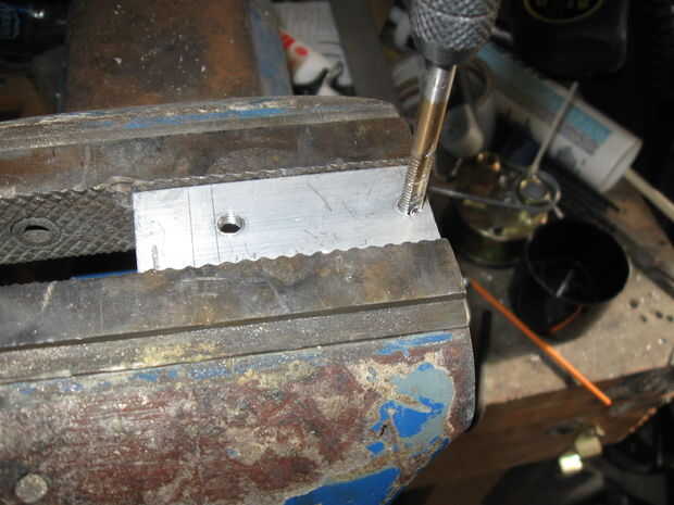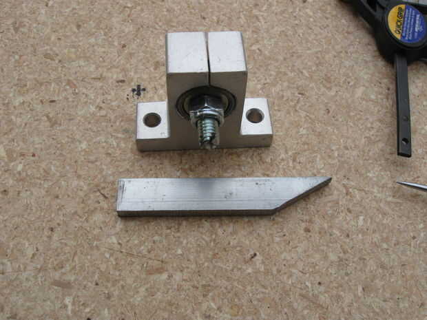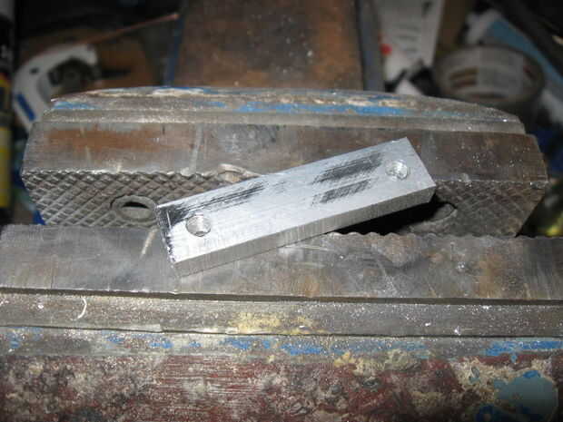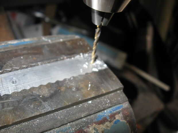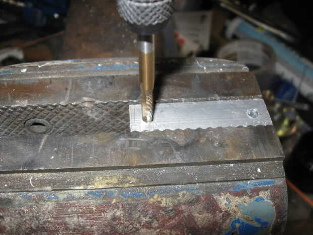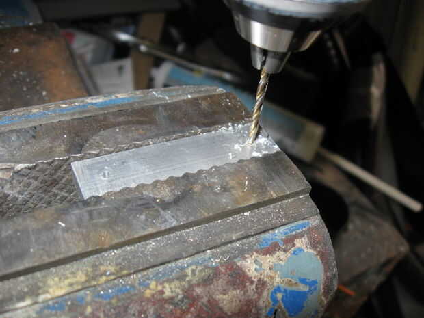 La cerradura de la diapositiva de cola se hace de 1/2 X 1/4 en la acción de barra de aluminio que es ligeramente más estrecha que la base del bloque de apoyo. Alinee visualmente los dos luego taladro y tap, utiliza 10-24 pernos cabeza debido a que la llave necesaria para apretar es del mismo tamaño exacto que los tornillos de fijación utilizados en el mandril de 4 mordazas. Coloque el retén deslizable debajo de la base y el soporte del tubo de desagüe del perno hacia abajo.