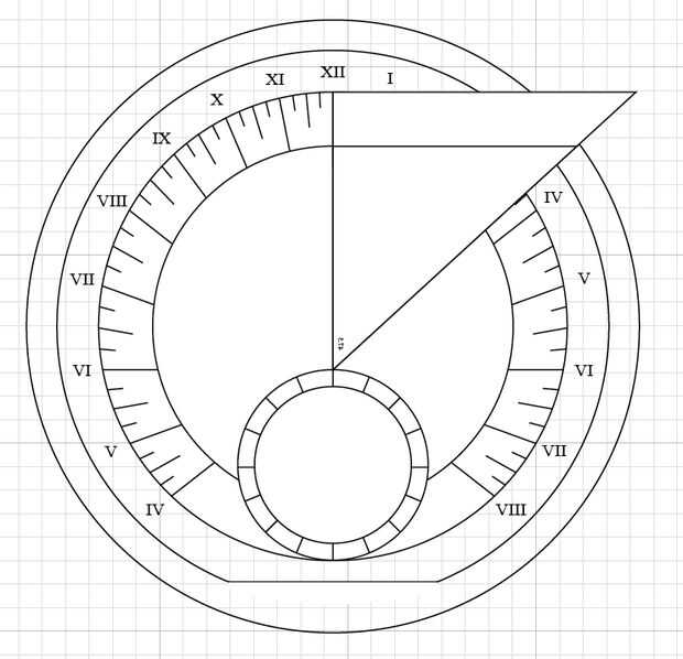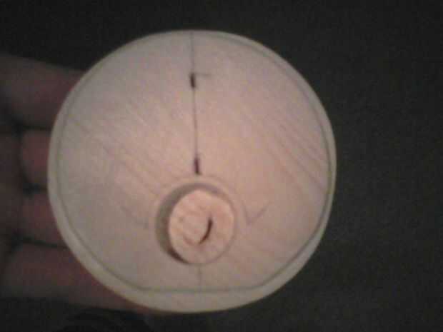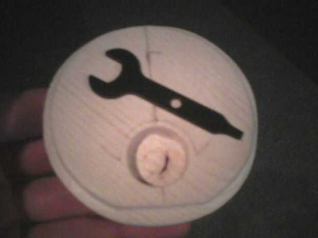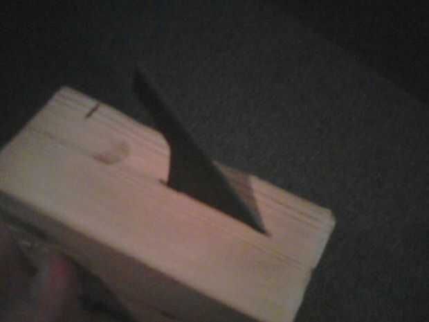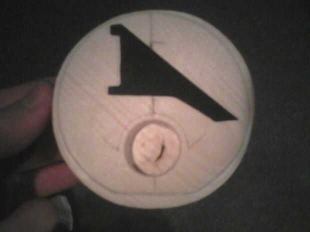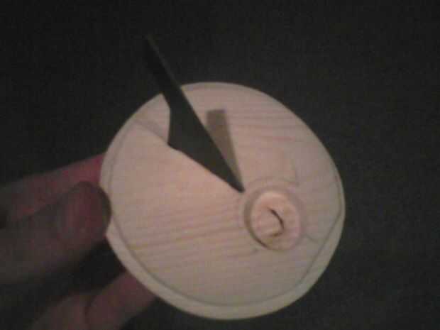 Para hacer las ranuras, usé la herramienta que viene con la dremel para abrir y cerrar la pinza. El extremo de la herramienta con la cabeza plana es apenas el tamaño correcto y tor forma crear las ranuras. Antes de hacer las ranuras, asegúrese de marcar una linea vertical en donde la línea del mediodía será y marcar donde deben ir las dos ranuras (desde el punto donde todo el tiempo las líneas se encuentran, hasta donde son visibles en el diseño de las líneas de tiempo). Es una buena idea utilizar una impresión de usted diseño como guía. A continuación, utilice un martillo para golpear este extremo de la herramienta en la cara un poco. Consulte con su gnomon para ver si es lo suficientemente profundo. Si no, seguir machacando en una pequeña cantidad en un momento hasta que el gnomon asiente al ras y las clavijas no se puede ver. En este punto, verificar nuevamente el ángulo correcto (lijado puede arreglarlo si está un poco apagado). Es una buena idea para probar este método en un pedazo de madera primero.