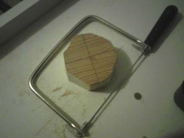 Cortar un segmento de 4 pulgadas de su 2 x 4 usando una sierra de mano (o una sierra de banda si tiene uno). Entonces, usando la brújula, dibujar un círculo que es un poco más grande que el tamaño total de su diseño (para lijar y pequeños accidentes). Lo mismo en el otro lado de la madera. Corte las esquinas y bordes a los lados de tus círculos para llegarlo más cerca al correcta forma y tamaño.