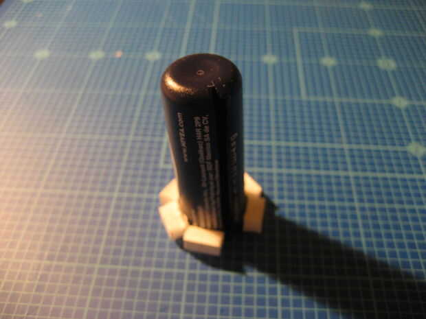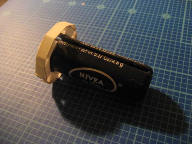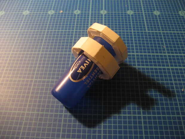 Los anillos de espuma fueron dimensionados para que no le rodean completamente el frasco. La idea aquí es mantener la ranura en el depósito libre de la llave se deslice a través. Para ello, pegar la tira de espaciador de espuma alrededor de la lata, dejando la ranura descubierta. El anillo de espuma para el ajuste. [Imagen 1]