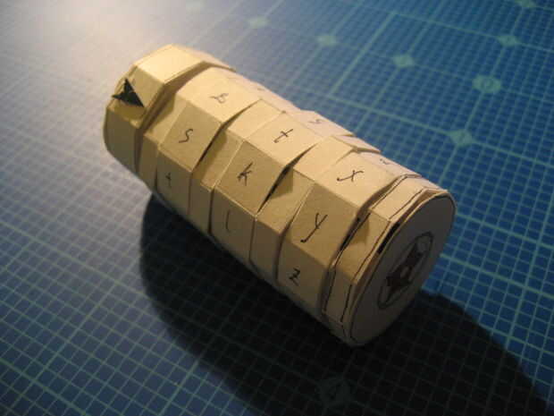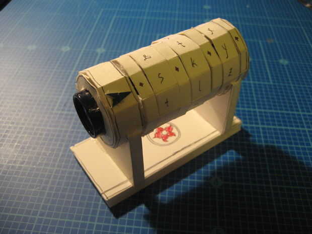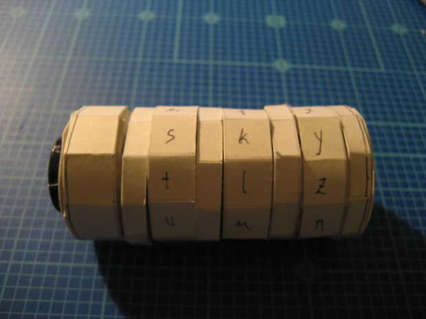 Ahora es tiempo de pensar una palabra de código. Puede ser arbitraria o la respuesta a un acertijo o un rompecabezas lógico en sí mismo. Este cryptex utiliza la palabra 'Cielo' para su desbloqueo. No hay suficientes espacios para escribir todo el alfabeto en los diales, para aleatorizar los personajes alrededor del anillo. [Imagen 1]