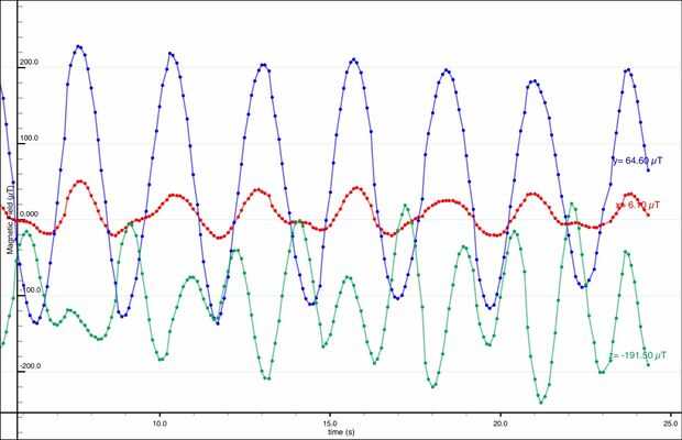 En la gráfica, el magnetómetro mide el cambio de flujo en 3 ejes, y la onda senoidal resultante corresponde a la masa del péndulo que hace pivotar hacia adelante y hacia atrás. Como un cheque, el gráfico muestra un período de un poco menos de 2 segundos, por lo que se comprueba con el cálculo del período.