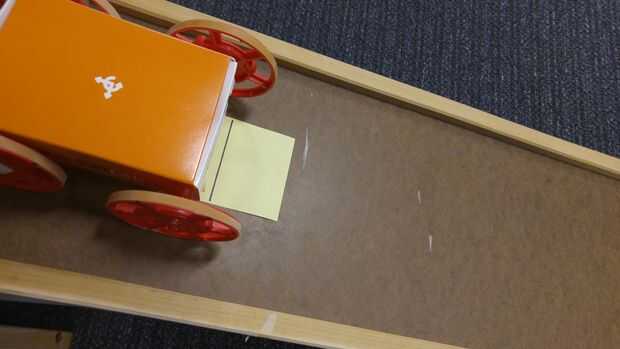 Cuando comience a probar sus amortiguadores de choque, necesita para asegurarse de que para cada ensayo la posición inicial y tiempo de la carreta de viaje son las mismas. Al mantener estos parámetros constantes, se pueden tomar mediciones consistentes de la efectividad de cada amortiguador de choque. Si marca una línea en la parte superior de la rampa, usted podrá saber exactamente donde liberar el carro para que cada juicio empieza a la misma altura. Además, debe mantener la distancia entre la parte inferior de la rampa y punto del carro de impacto del mismo. Al colocar el amortiguador del choque entre la rampa y la barrera de desplome, necesitará mover la rampa o la barrera para que la distancia entre la parte inferior de la rampa y la parte delantera de la almohadilla de bloqueo es igual a la distancia original entre la parte inferior de la rampa y la barrera de desplome. En las fotos anteriores se puede ver que las distancias de la rampa a la pared y de la rampa para el amortiguador de choque papel taza acordeón son cerca de 20 centímetros.