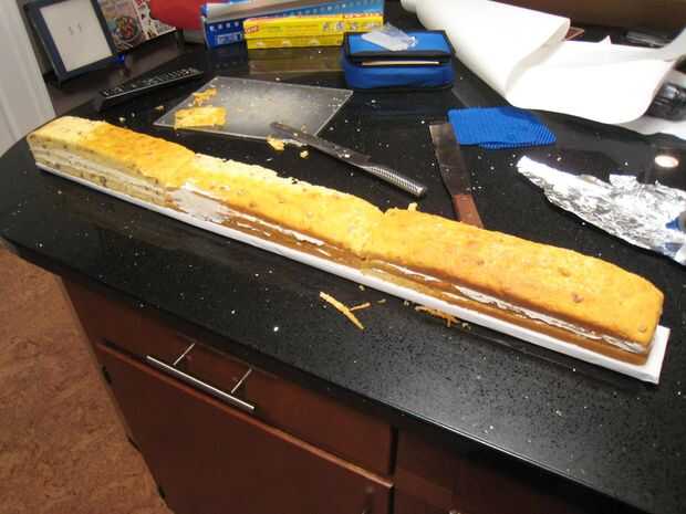 Ponen al fin en un tablero de la torta. Hice mi tablero de la torta con varias capas de cartón grueso, pegadas y cubiertas con papel de congelador de alimentos seguros.