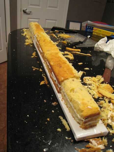 Con un cuchillo serrado, tallar la forma general de lo Pocky. Básicamente sólo los cantos y hacer una porción de un extremo más pequeño como se ve en la foto. Dejó el cuchillo haga el trabajo y no empujar demasiado duro, ser suave y utilizar un movimiento de sierra para cortar la torta. El más frío el pastel, más fácil es para tallar. Debe hacer el tallado poco después sale de la nevera, porque no podrás colocarlo en la nevera después de poner juntos. (Salvo que tenga algún tipo de loca refrigerador industrial masiva).