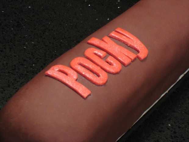 Me adherí las letras del pastel con una pequeña cantidad de agua y con un pincel seco espolvoreado en "polvo de brillo" (disponible en tiendas de suministros de pastel) para lograr el acabado brillante groovy.