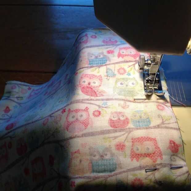 Prender el exterior tela derecho lados juntos a lo largo de los lados largos. Me resulta más fácil poner los pines en ángulo recto al borde de la tela, ya que es más fácil coser sobre ellos.