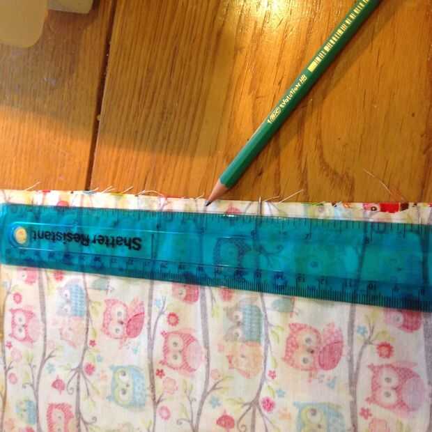 El siguiente paso es coser una costura en cada lado, 1/2" del borde de la tela para unir a la tela en forma de tubo. Sin embargo tengo una confesión, mis habilidades de corte son pobres y porque hago muchas de estas bolsas, intento conseguir tantas bolsas como sea posible de mi tela, y por lo tanto a veces cortan un poco más pequeño de lo que debería. Así que mi método es el siguiente - quiero que la distancia entre mis costuras laterales sea exactamente de 8", así que utilice una regla y dibujar una línea a ambos lados de la tela 8" aparte que me da la posición de mis costuras. Esto significa que a veces son más pequeños que 1/2", pero esto no importa.