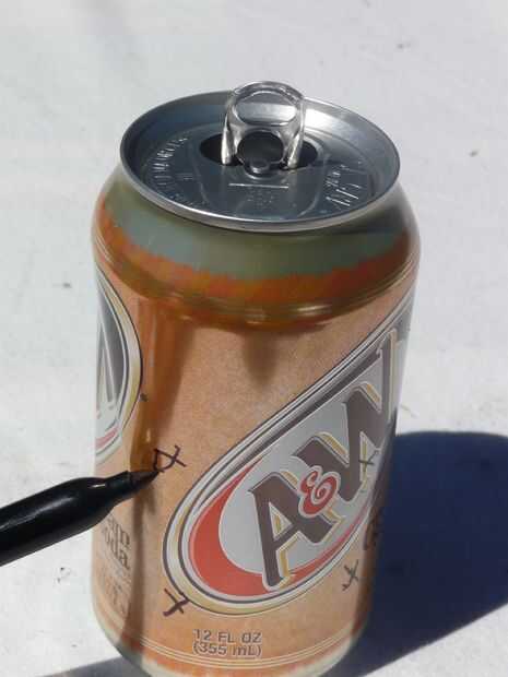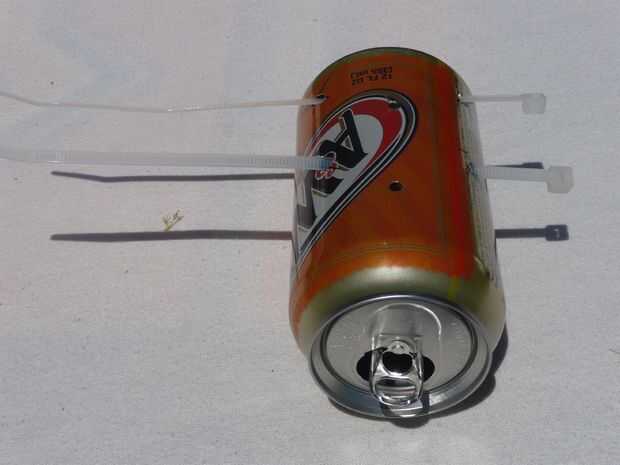 Utilizando una dremel, taladre los orificios en ambos lados de la lata donde los marcaste. El aluminio es blando, pero también es difícil y puede conseguir squirrely un poco. Controlar la presión del taladro porque una vez que el metal le da a la broca, da. Tenga cuidado y no permita que el alejarse de usted.
