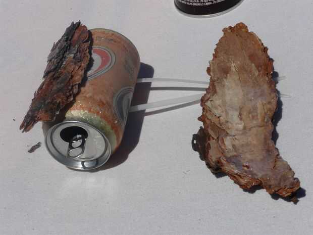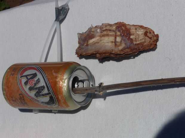 Usaba la corteza seca y musgo natural de mi propiedad, pero cualquier material natural, lento para descomponer trabajará para camuflar la lata de soda.