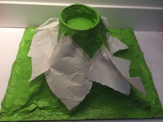 Pintura de aerosol del volcán todo tu color de base. En este ejemplo hice verde. Deje que se seque. Cinta adhesiva de la parte inferior en la forma que desee. Cubra el área por debajo de la cinta con un Poco de periódico. Rocíe su segundo color. Deje que se seque. Retire la cinta. Más pintura de aerosol en su segundo color si quieres hacerlo gotear. Déjelo secar.