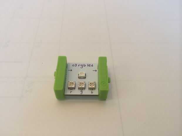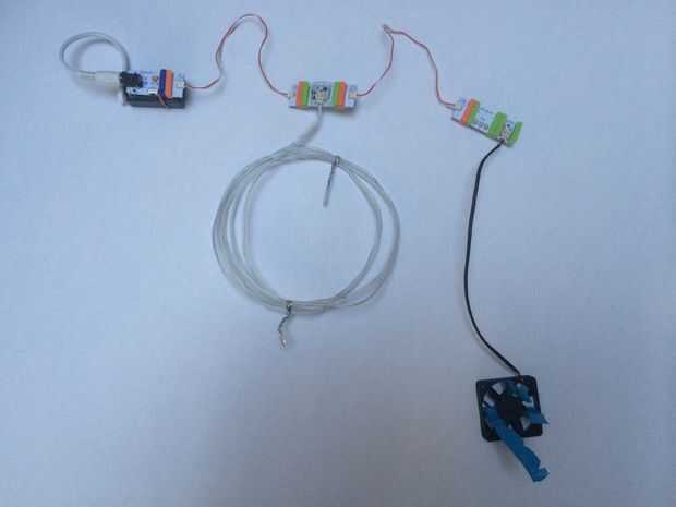 Construir circuito de Pequeños pedacitos como se muestra en la foto con el ventilador, cable x2, cable luz, LED RBG y una fuente de energía. Establecer el pequeño LED RBG de Bits para los colores que te gusta.
